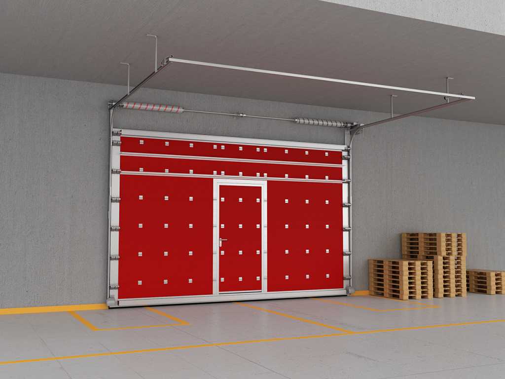 По периметру противопожарных секционных ворот устанавливаются резиновый уплотнитель и терморасширяющаяся лента, которая при нагревании увеличивается в размере и герметизирует ворота. Благодаря тому, что ворота открываются вверх и откатываются под потолок, они не занимают много места внутри помещения, оставляя свободное пространство у проема. Большой выбор типов подъема ворот позволяет устанавливать их в помещения с различными размерами притолоки.